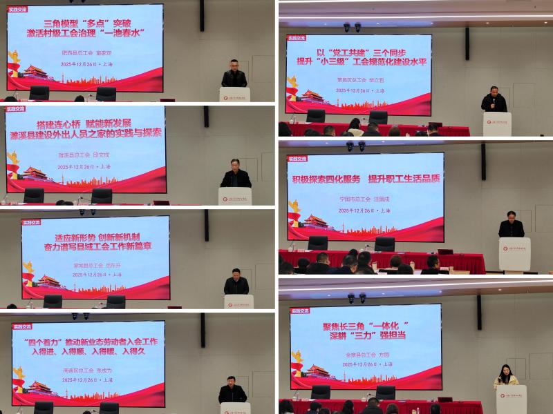 在大会交流环节,合肥肥西、淮北濉溪、亳州蒙城、滁州南谯、芜湖繁昌、宣城宁国、六安金寨等县区工会领导就本地创新实践进行大会发言。